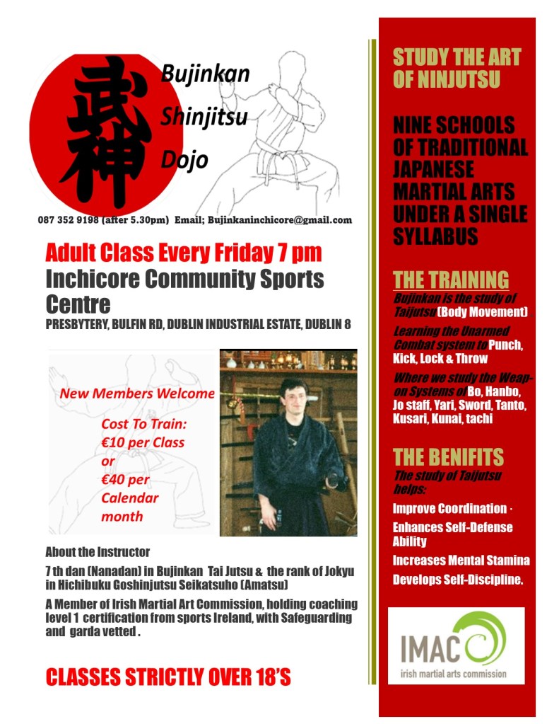 Bujinkan Shinjitsu Dojo Adult class meets on Friday’s at 7pm in the Presbytery, Bulfin Rd, Dublin Industrial Estate, Dublin 8